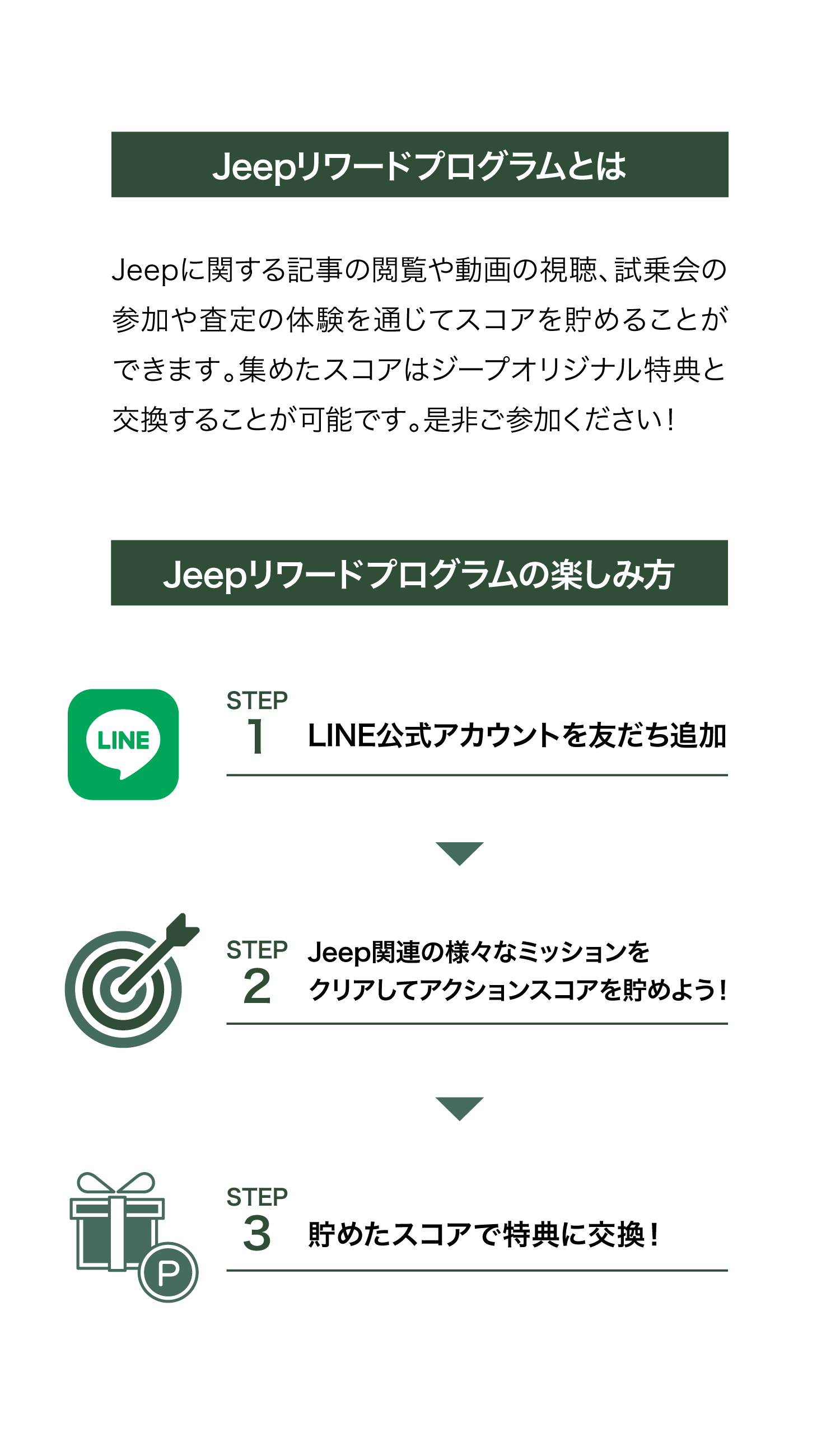 Jeepブランド関連のウェブ記事・公式サイトページの閲覧、動画の視聴、試乗会参加、査定などをすることでJeepアクションスコアを貯めると、各種景品と交換できます。